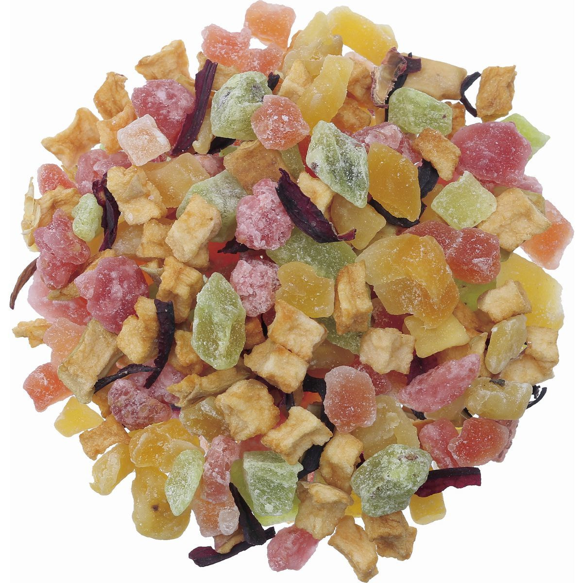 有機ドライアップル(オーストリア製造)、加糖ドライマンゴー、加糖ドライパパイヤ、加糖ドライストロベリー、加糖ドライキウイフルーツ、加糖ドライバナナ、有機ハイビスカス/香料、クエン酸、保存料(亜硫酸塩)、着色料(赤40、黄4、青1)